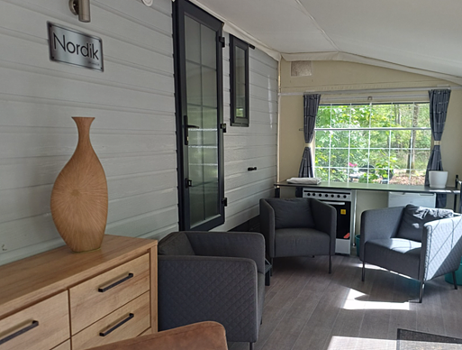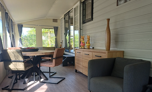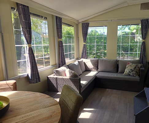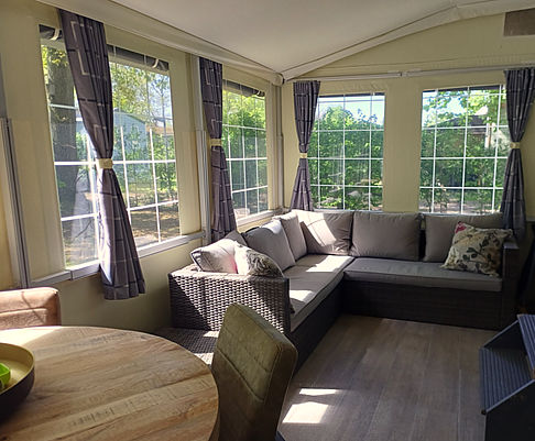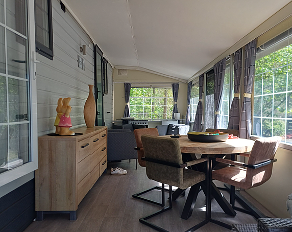 - Ruime volledig gemeubelde voortent met schuifdeur en vliegdeur