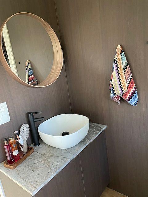 In de badkamer is er een mooie betegelde vloer, douche, toilet en lavabo met spiegel en meubel.