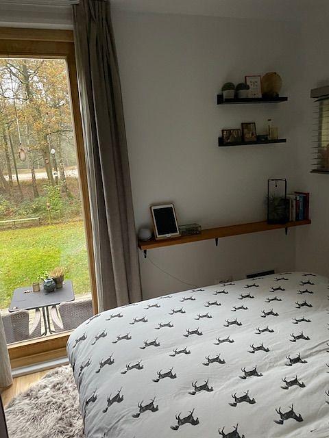 De slaapkamer heeft een ingebouwde kastenwand en een bed van 1m40 met praktische bergruimte.